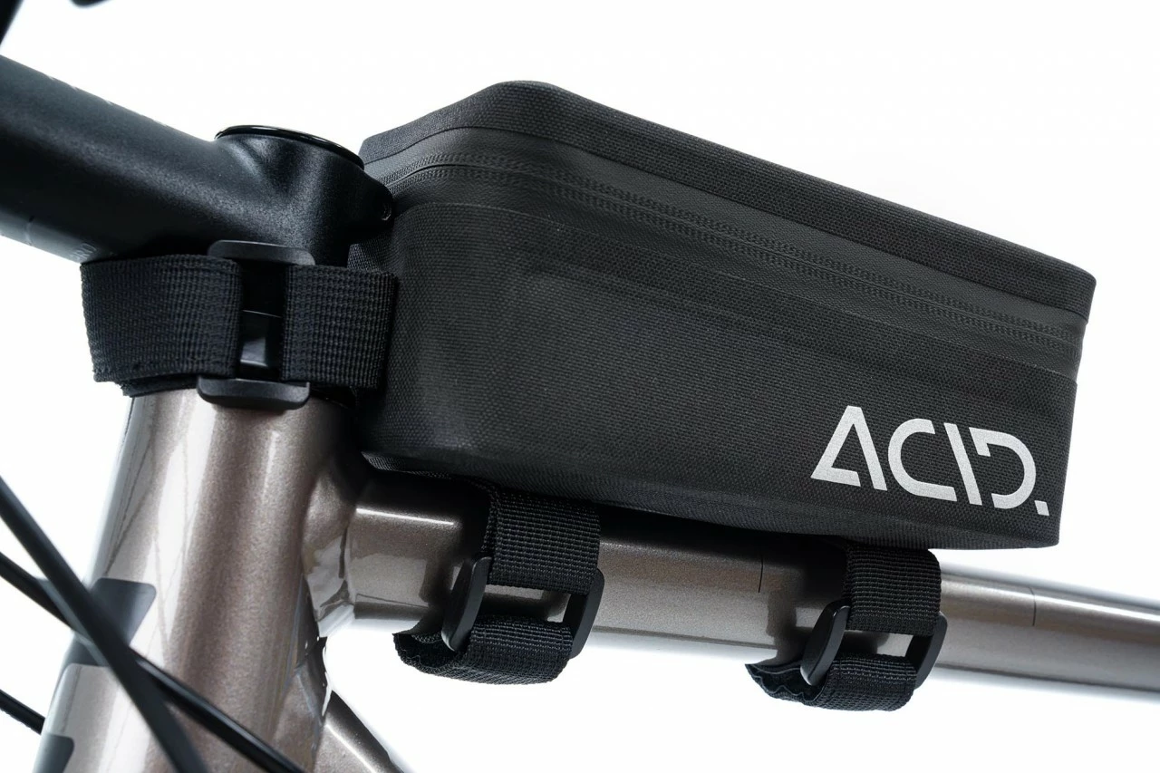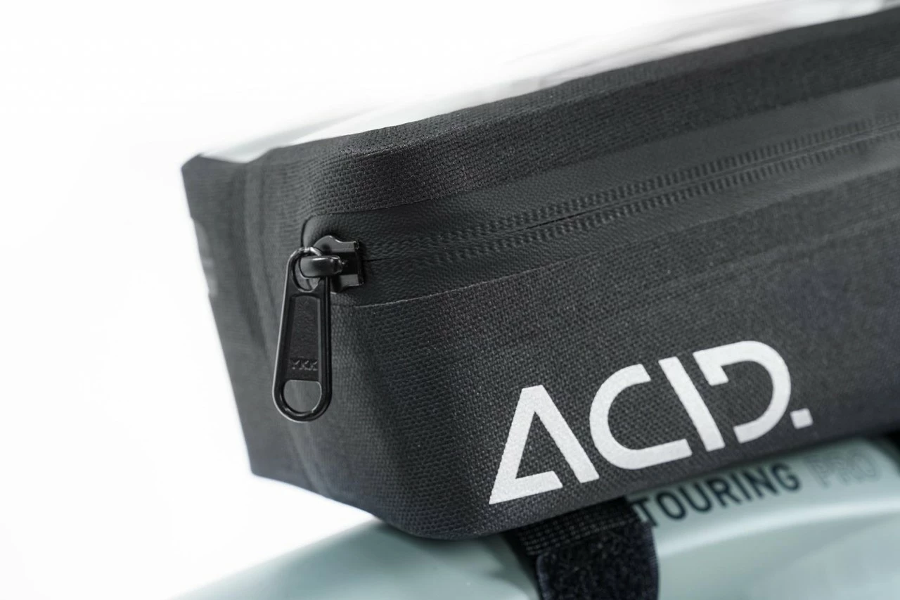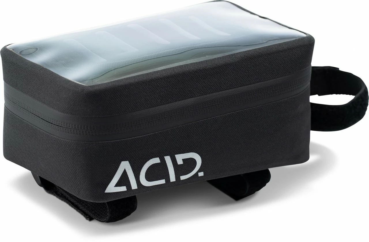 Die ACID TOP TUBE View Oberrohrtasche aus PVC-freiem TPU ist bestens gewappnet gegen schlechtes Wetter und mit ca. 1 Liter Stauvolumen sind Energieriegel, Geldbörse, Werkzeug und Co. schnell greifbar verstaut. Das große Smartphone-Fach bietet Platz für alle Smartphones mit einer maximalen Länge und Breite von 17 x 8,5 cm und mit der empfindlichen Touchscreenfolie lässt sich meine Handynavigation schnell und einfach bedienen.