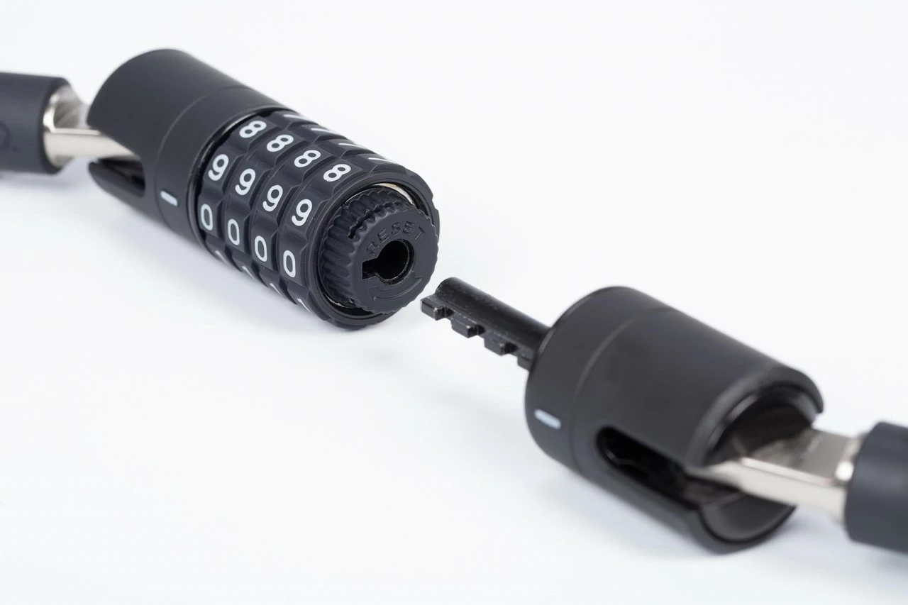 Das extra sichere Kabelschloss der CORVID C Serie zeichnet sich nicht nur durch sein besonders flexibles und verstärktes CORE+ Stahlkabel aus, sondern auch durch seine 180° rotierbare EASY WING Kabelanbindung. Das Schloss ist komplett mit weichen Kunststoffoberflächen ausgestattet um den Rahmen vor Kratzern und die Technik vor Korrosion zu schützen. Zudem bietet die GRIP+ Oberfläche an Schlosskörper und den frei einstellbaren Kombinationsrädern maximale Griffigkeit.