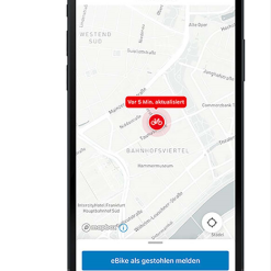 Verfolge den Standort deines eBikes auf dem Smartphone: Sollte dein eBike gestohlen werden und die Funktion eBike Alarm dir eine Benachrichtigung senden, startet automatisch das Tracking. Über die eBike Flow App kannst du den Standort deines eBikes sehen und an die Polizei weitergeben.