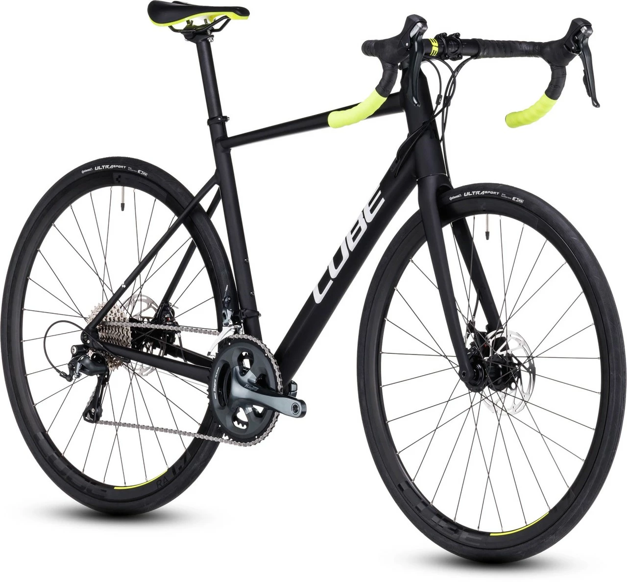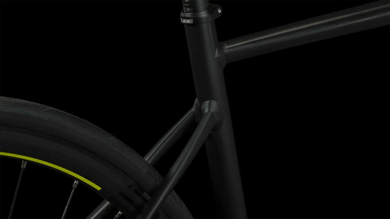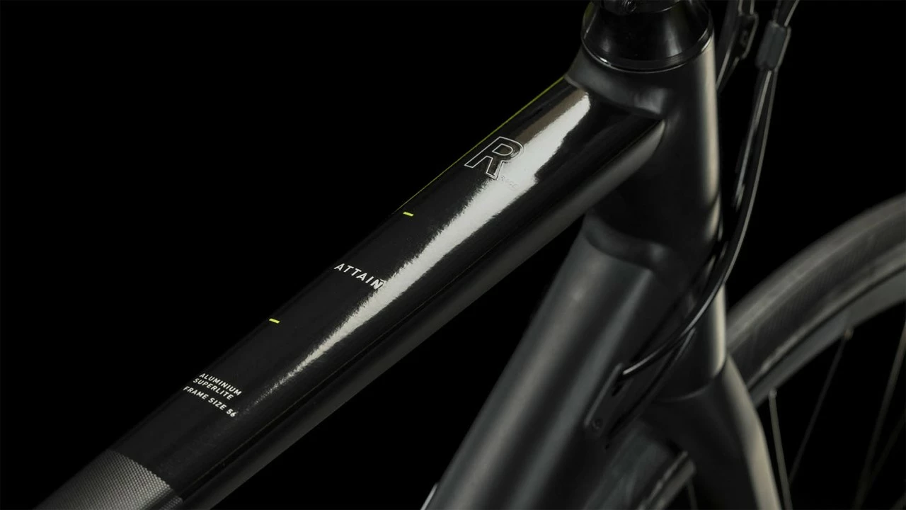 Das Attain Race vereint die Vorzüge eines schnellen Rennrads mit dem Komfort eines leichtgewichtigen Touring-Bikes. Dank schnell rollender und zugleich griffiger Continental Ultra Sport Faltreifen auf CUBE Laufrädern in Kombination mit einer Carbongabel und einem durchdachten Rahmendesign bist so ebenso komfortabel wie schnell unterwegs. Präzise Schaltvorgänge per Fingerzeig vom Lenker aus: Um die perfekte Abstimmung kümmert sich die Shimano Tiagra 2×10-fach Schaltung. Und die kraftvollen mechanischen Scheibenbremsen machen selbst dann souverän und zuverlässig ihren Job, wenn die Straßen nass sind. Kurz gesagt: Mit diesem Bike ist dir deine Horizonterweiterung sicher! Wer seinem Lieblingssport frönt, sollte sich nicht quälen müssen. Deshalb haben wir bei der Entwicklung des Attain Rahmens aus 6061er-Aluminium (inklusive Aufnahmen für Scheibenbremsen) auch viel Wert auf Performance bei zugleich hohem Komfort gelegt. Durch die doppelt konifizierten Rohre wurde, wo möglich, Gewicht gespart – selbstverständlich ohne Einbußen in Sachen Stabilität und Steifigkeit. Das konische Steuerrohr und Steckachsen vorne und hinten sorgen für ein superpräzises Lenkverhalten und maximale Kraftübertragung. Und die schlanken Sitzstreben und die Vollcarbongabel schlucken etwaige Schläge und Vibrationen vom Straßenbelag und optimieren so den Fahrkomfort. Last, but not least verleihen die im Smooth Welding Verfahren gestalteten, glatten Rohrverbindungen dem Chassis seinen cleanen, überaus edlen Look.