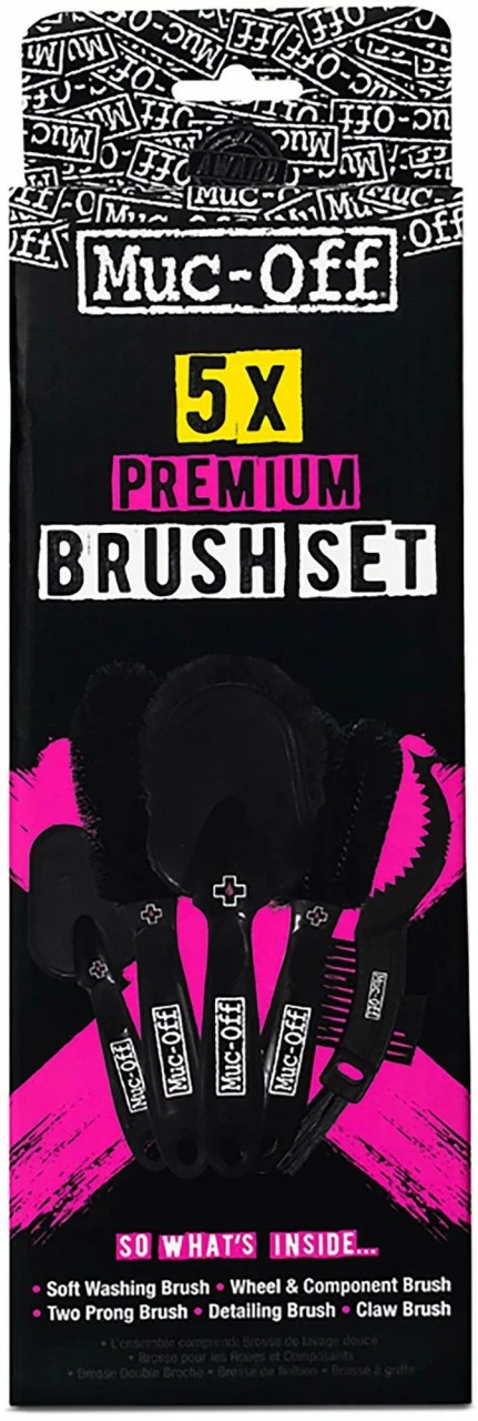 Das Muc-Off Brush Set 5x enthält 5 Bürsten, die spezielle auf die Fahrradpflege ausgelegt sind. Sie eignen sich für das großflächige Entfernen von Schmutz sowie für das Reinigen von Details, wie Zahnkranz und Ritzel.