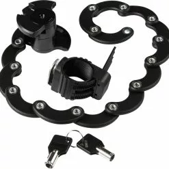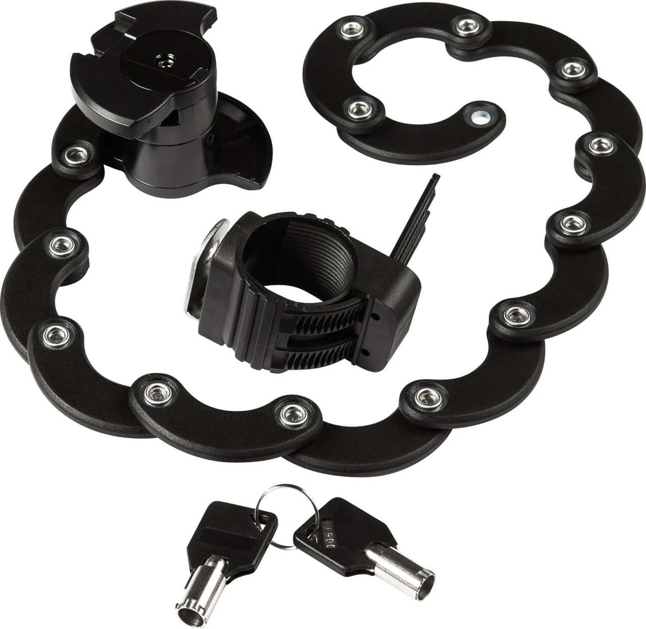 Das sowohl hochsichere als auch handliche Faltschloss ist 600 mm lang und überaus funktional bei geringem Packmaß. Die Kunststoffbeschichtung schützt den Rahmen vor Kratzern und das Schloss vor Korrosion; inkl. zwei Schlüssel und Halterung.
